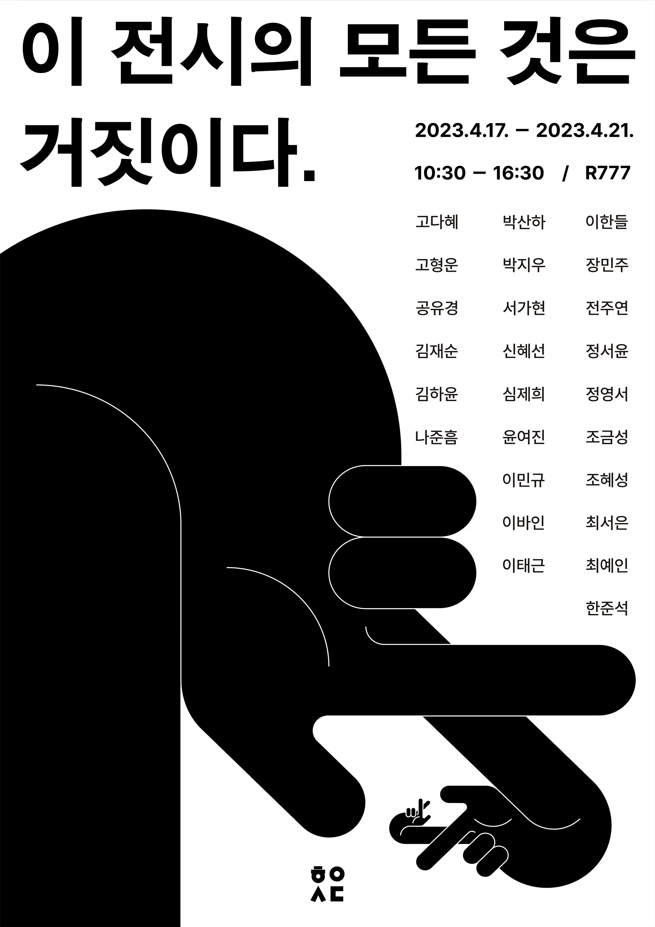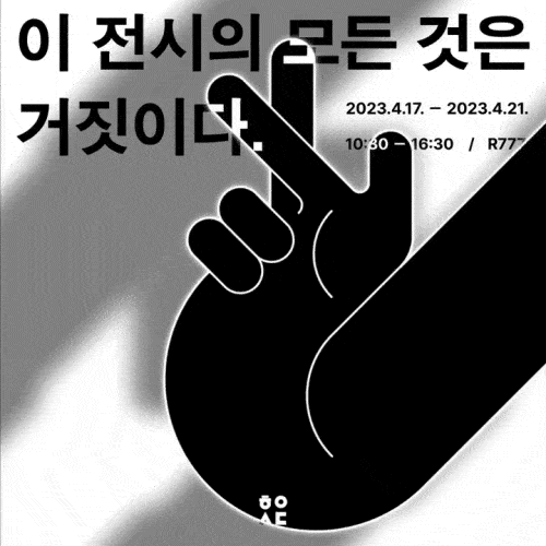 ‘이 문장은 거짓이다’는 잘 알려진 거짓말쟁이의 역설(Liar Paradox)이다. 문장을 사실이라고 전제하면 문장 내용은 거짓이 되고, 문장을 거짓이라고 전제하면 문장 내용이 사실이 되는 역설이 무한히 되풀이된다. 등 뒤에서 손가락을 꼬는 거짓말의 제스처를 메인 그래픽으로 선정했고, 끝없이 이어지는 프랙탈 구조의 루프 모션으로 전시의 테마를 시각화했다.