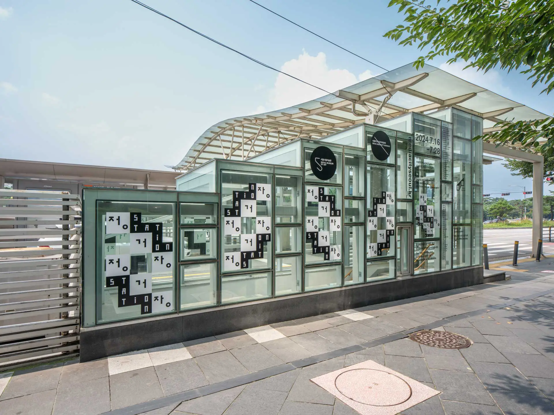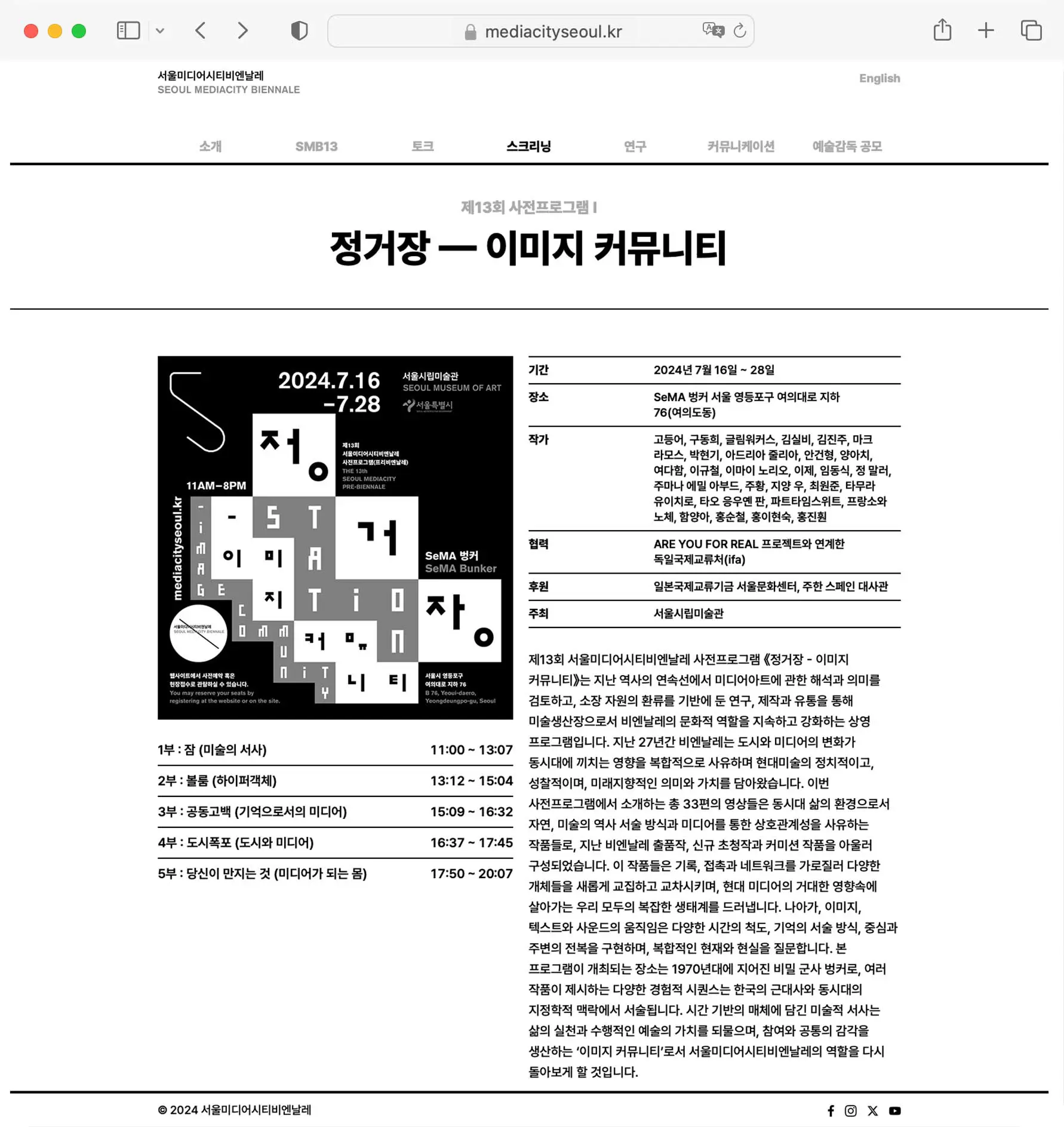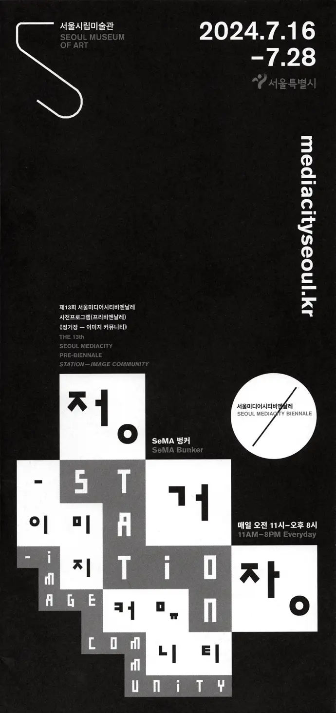 제13회 서울미디어시티비엔날레 사전프로그램 《정거장–이미지 커뮤니티》는 미디어아트를 역사적 맥락에서 조망하고자 하는 상영 프로그램이다. 그래픽 아이덴티티는 SeMA 벙커 상영관으로 향하는 계단, 작품이 상영되는 스크린과 스크린에 투영된 픽셀을 모티프로 삼았다.