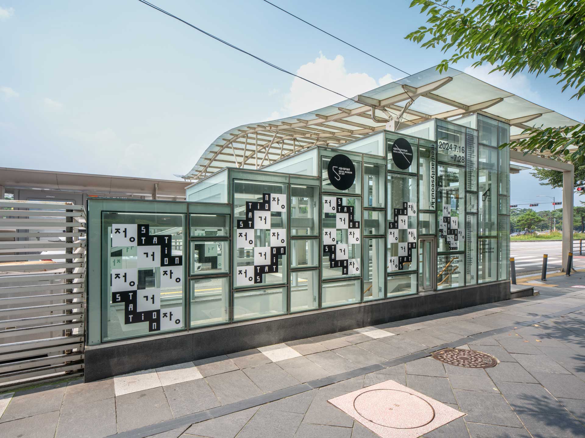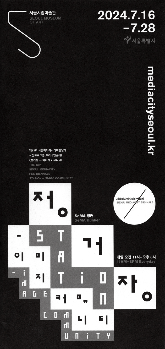 제13회 서울미디어시티비엔날레 사전프로그램 《정거장—이미지 커뮤니티》는 미디어아트를 역사적 맥락에서 조망하고자 하는 상영 프로그램이다. 그래픽 아이덴티티는 SeMA 벙커 상영관으로 향하는 계단, 작품이 상영되는 스크린과 스크린에 투영된 픽셀을 모티프로 삼았다.