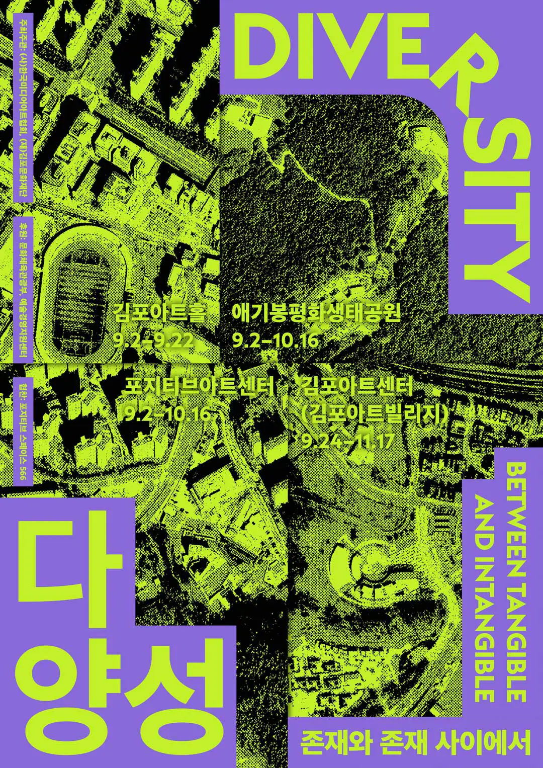《다양성: 존재와 존재 사이에서》는 김포가 가지고 있는 문화 다양성을 다양한 시선으로 바라보는 전시다. 글자가 다양한 각도로 맞물려 흐르는 시스템을 구성했고, 전시가 열리는 네 장소의 위성사진을 뒷표지 전면에 배치했다.